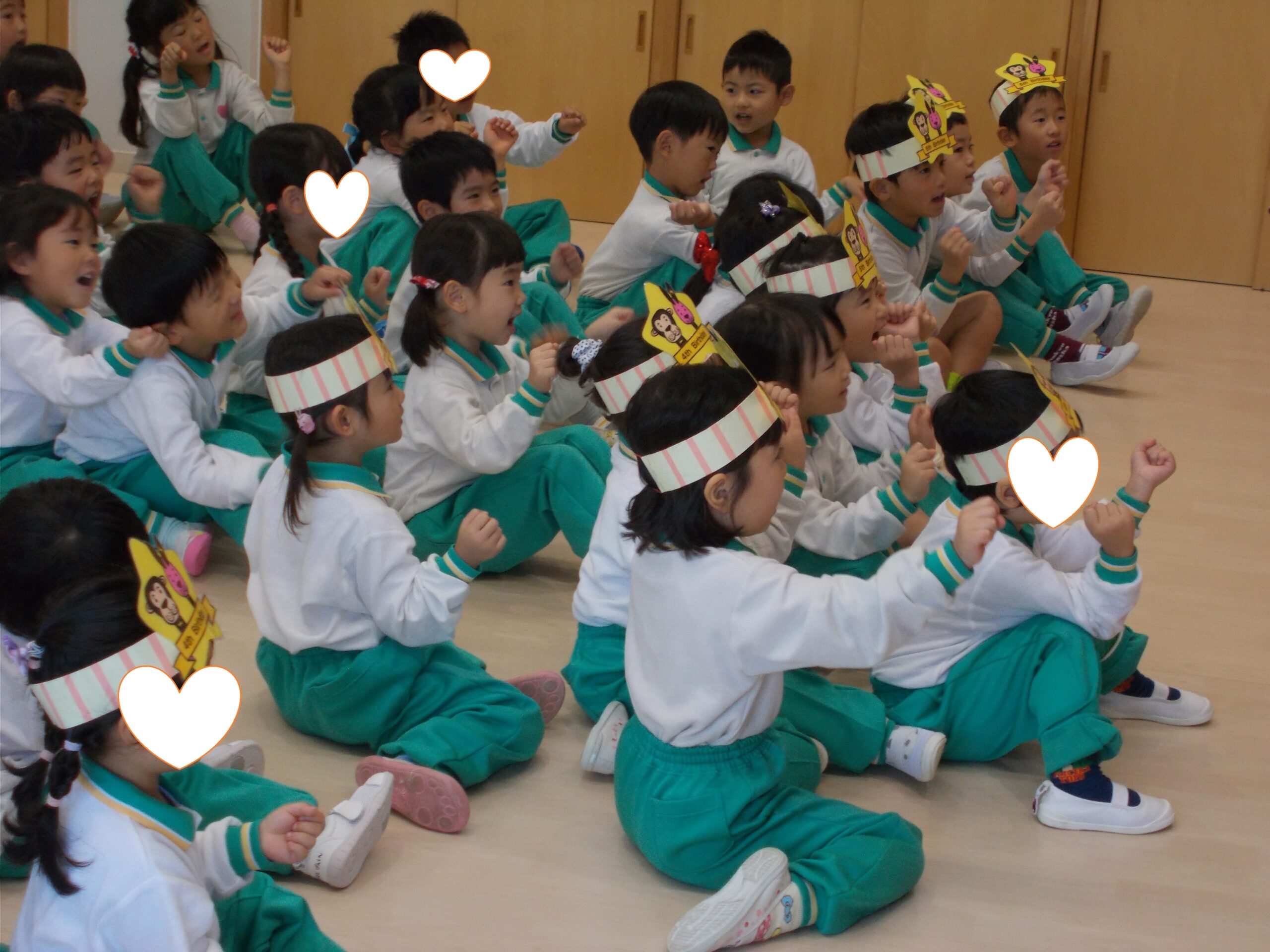 頭にお誕生日の飾りをつけて入場した子どもたちは、