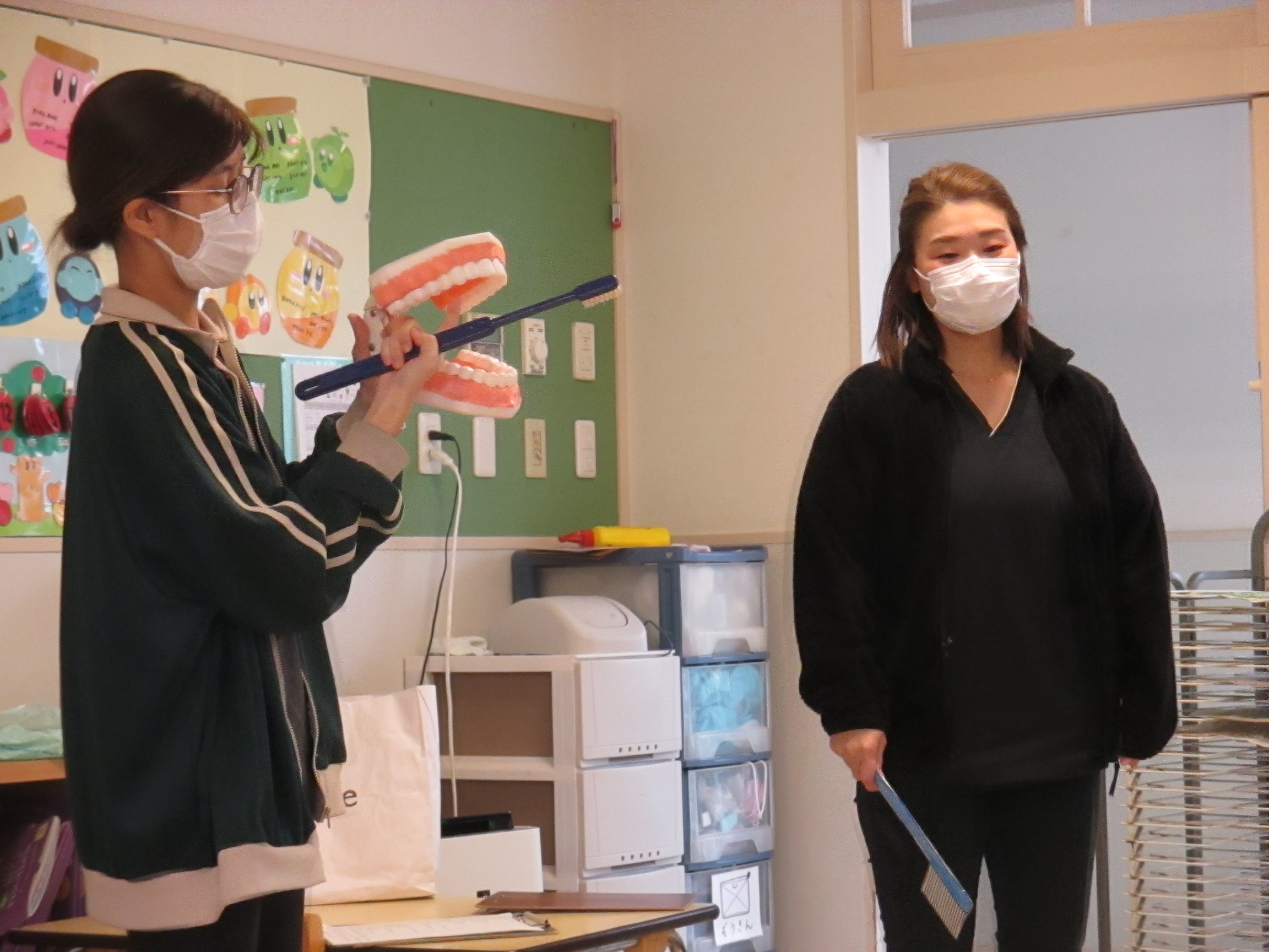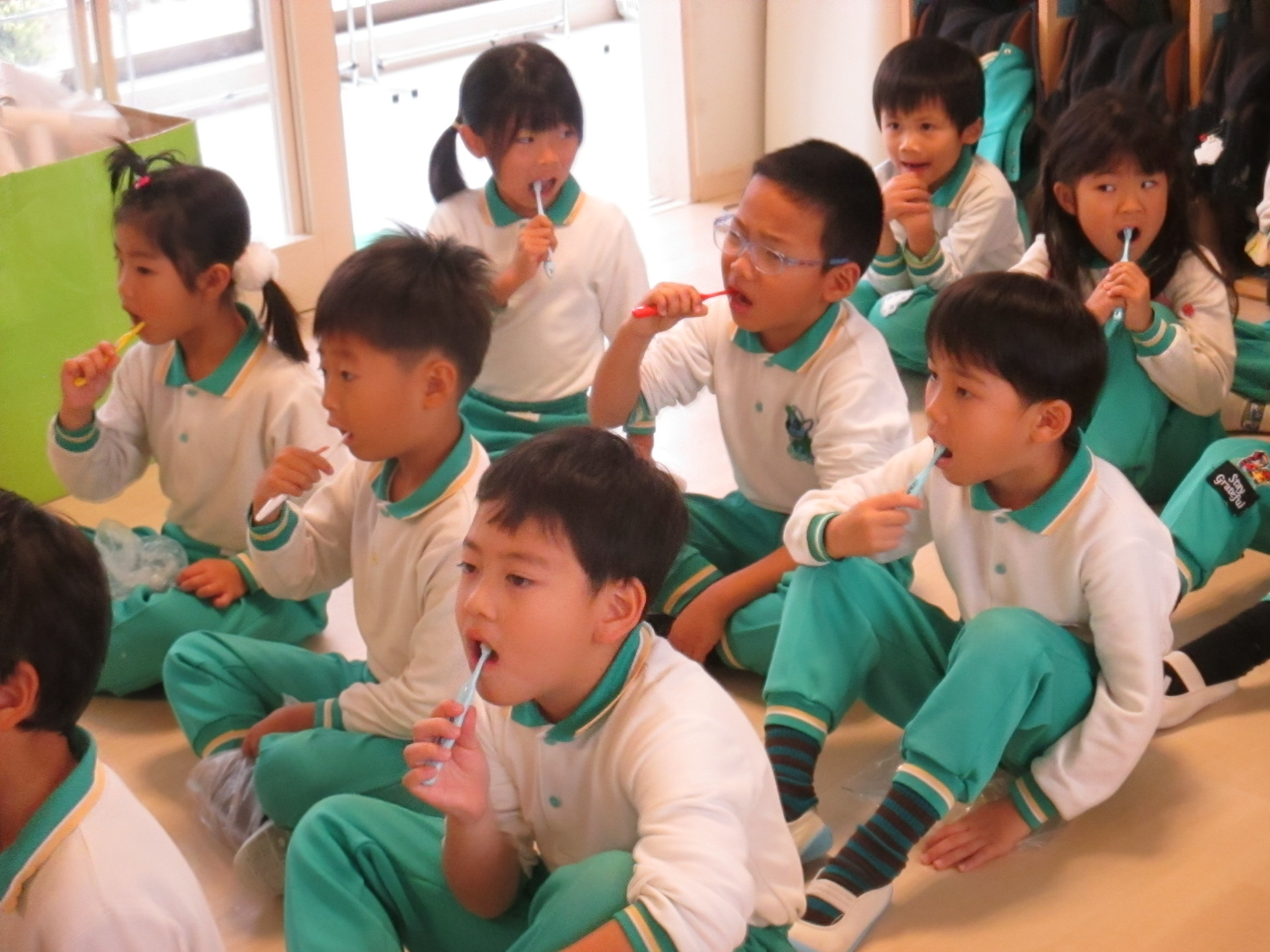 みんな自分の歯ブラシを使って、先生の真似をしながら