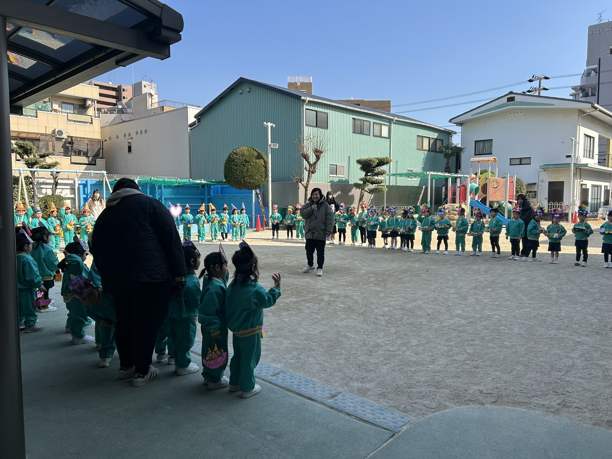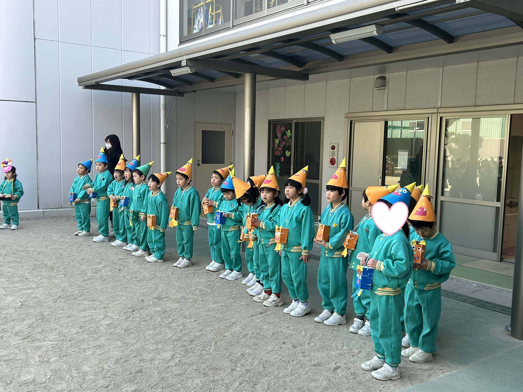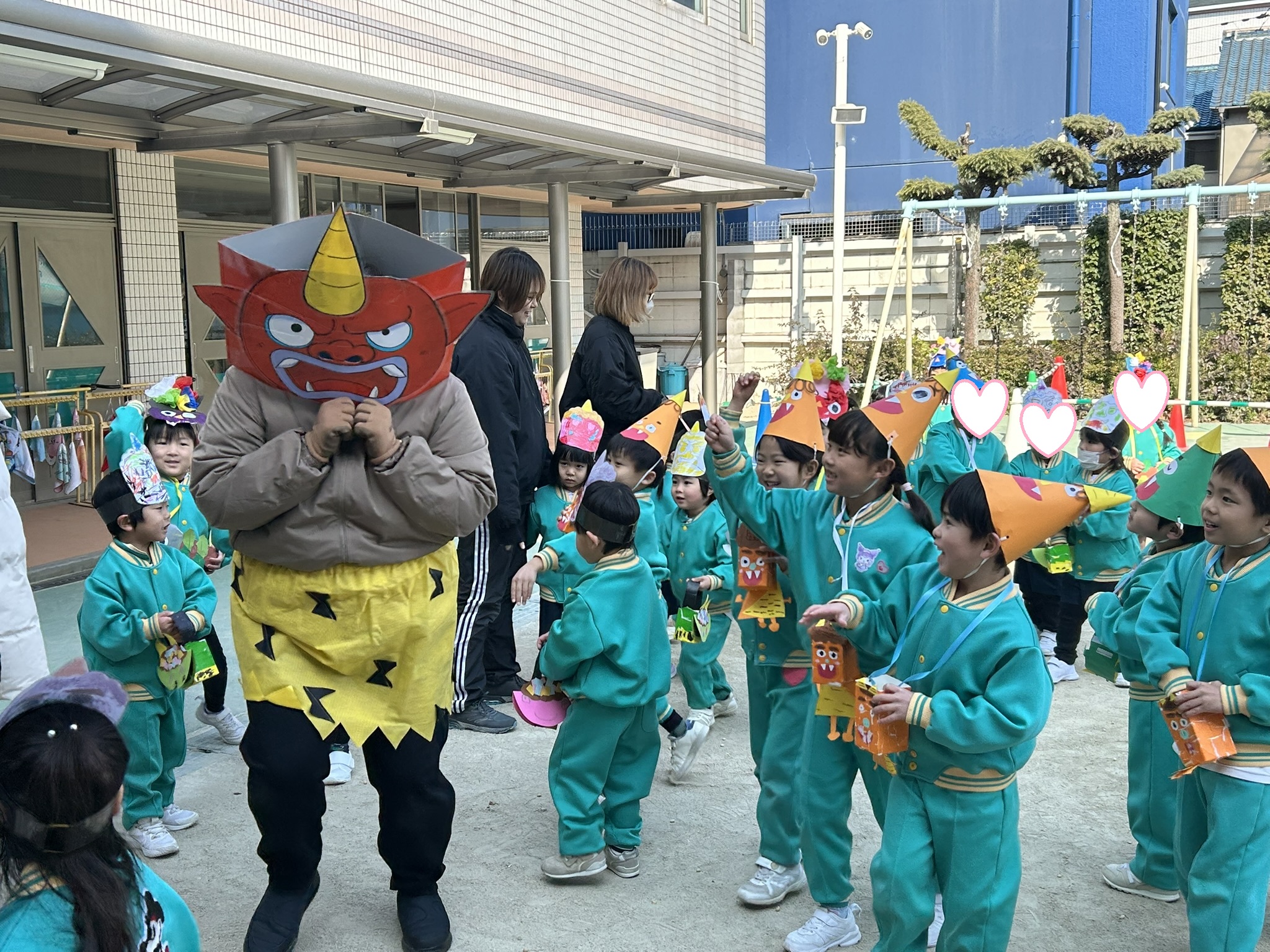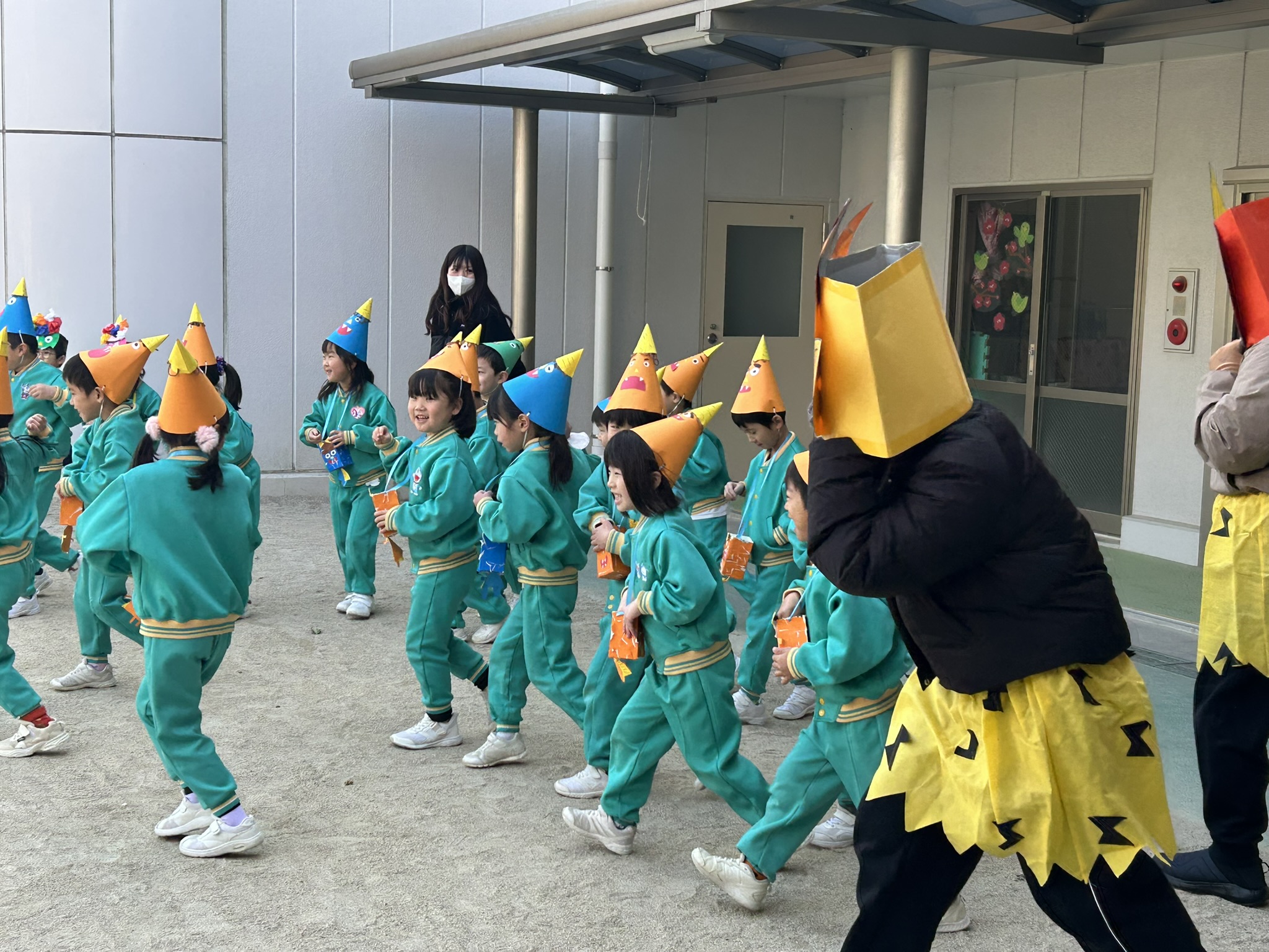 今年もカラフルなお面をかぶって、園庭で豆まきをしました。