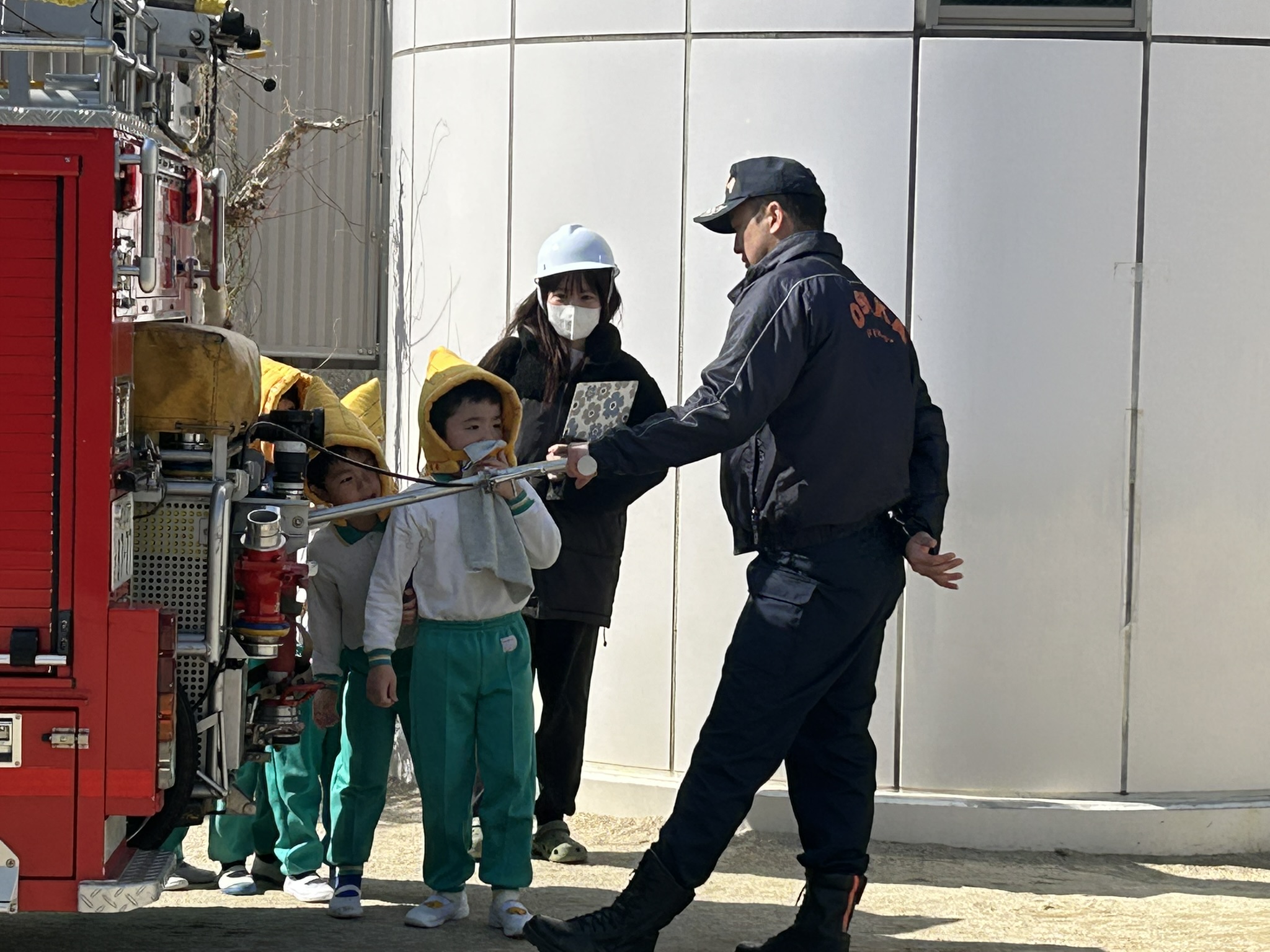 職員の消火器訓練も行い、最後は消防車の見学も